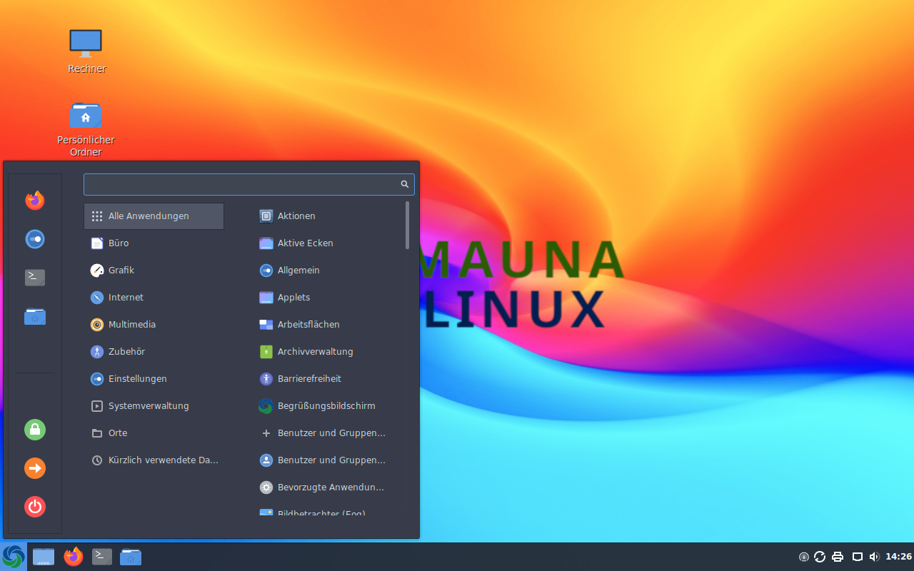 Mauna Linux basiert auf Debian und kommt aus Brasilien. In der Live Version dient Gnome als Desktop Oberfläche. Bei der Installation kann dann aus 5 verschiedenen Desktops ausgewählt werden. Ich habe mir die Version mit der Cinnamon Oberläche (bekannt von Linux Mint).