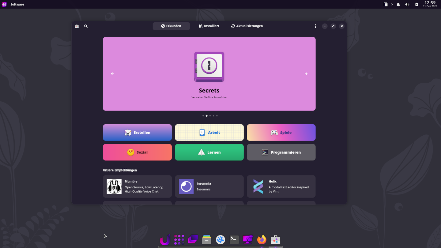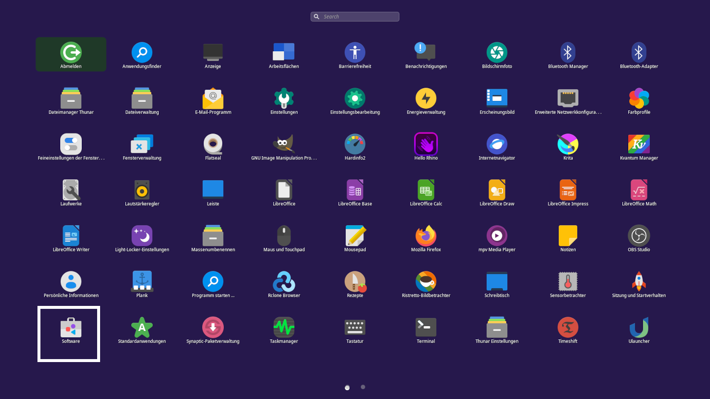 Hier kann nun nach einem Paketmanager gesucht werden. Da Rhino Linux auf Ubuntu basiert, sucht man nach Gnome Software und dazugehörigen Paketquellen: