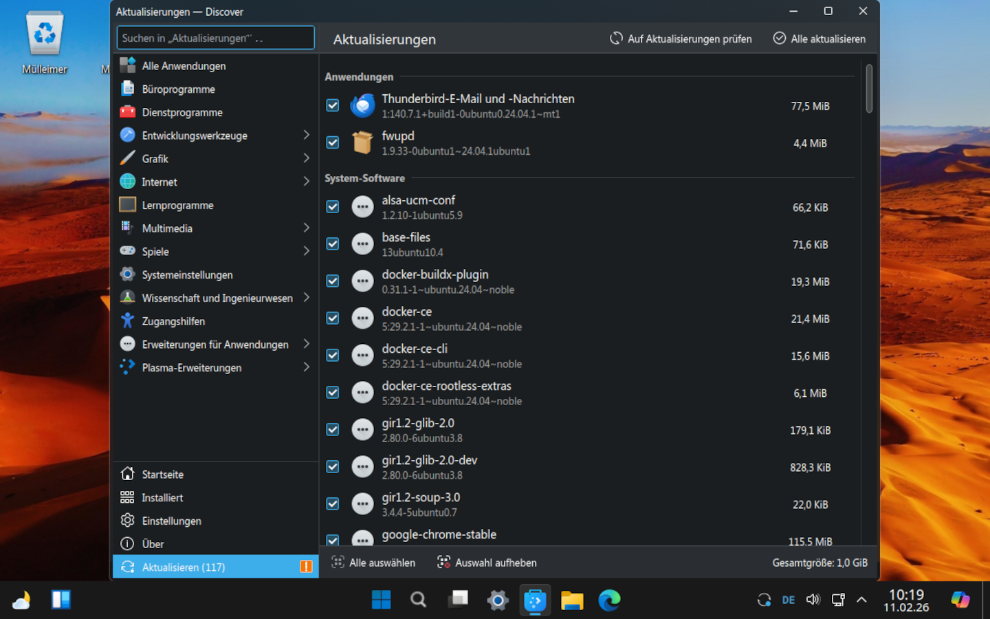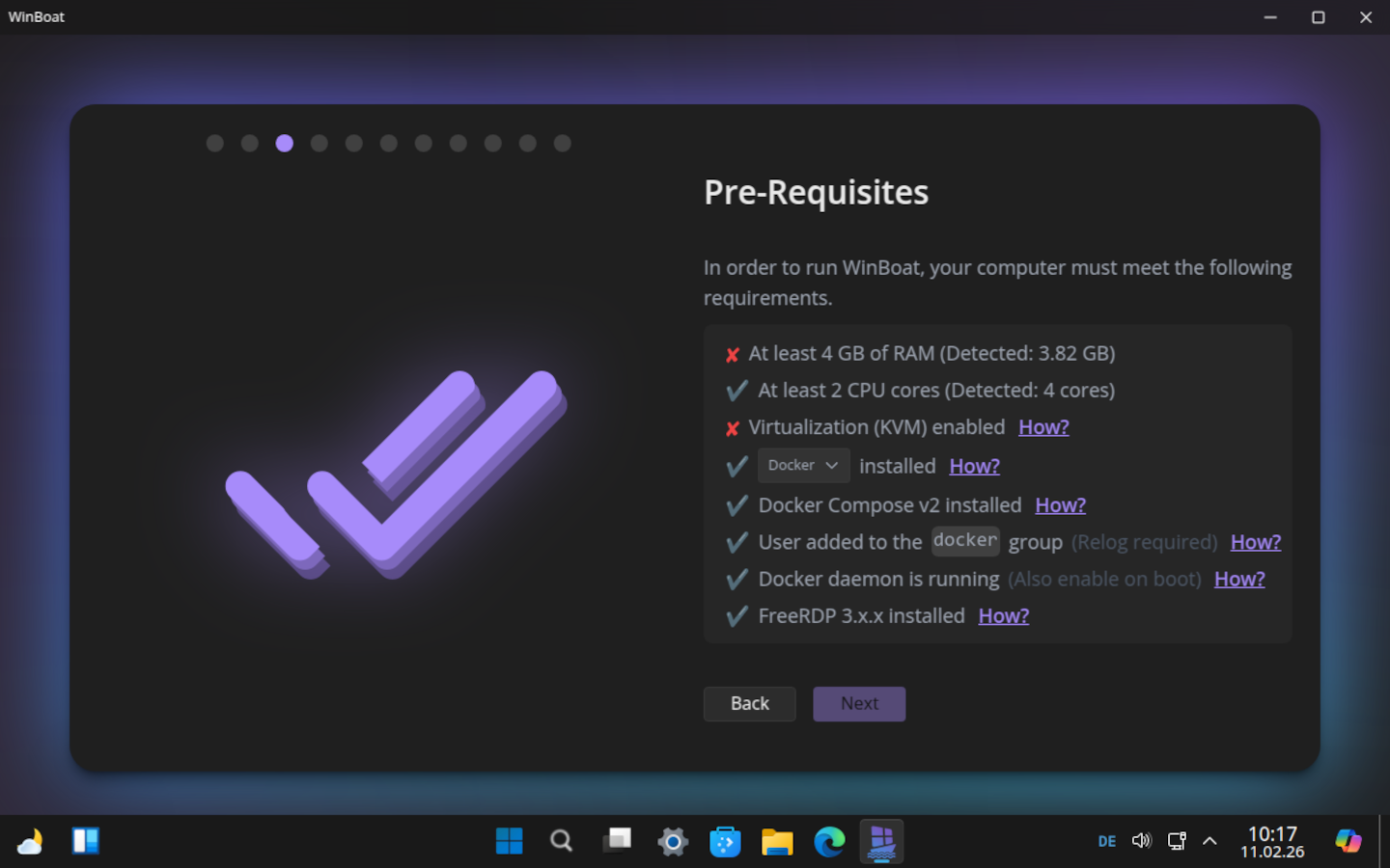 Winboat ist vorinstalliert. In der Virtuellen Maschine ist allerdings zu wenig RAM eingestellt und die KVM Virtualisierung muss nachinstalliert werden.