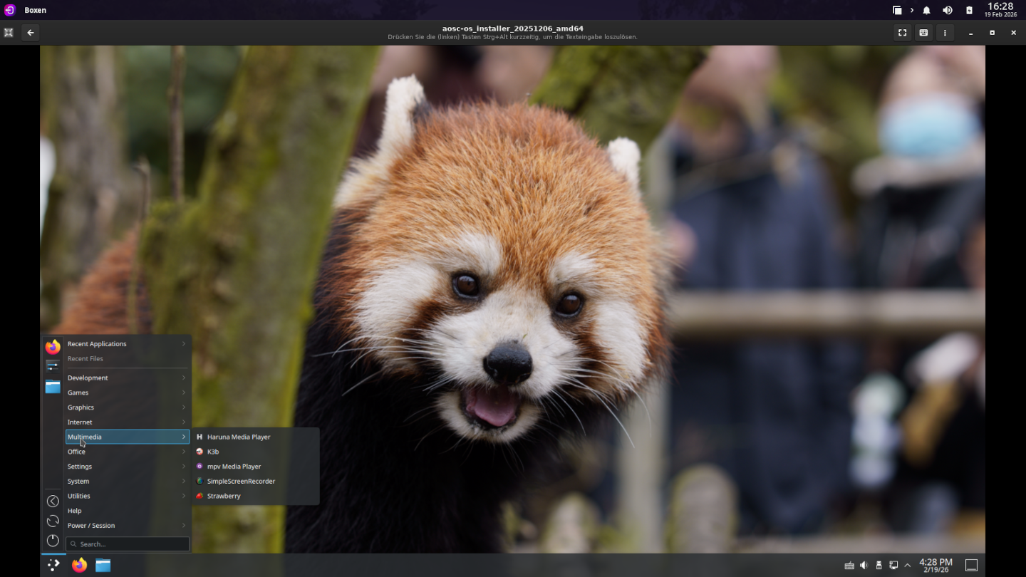 Antong OS von AOSC, ist eine chinesische Distro, die eigenständig von Leuten, die an diversen Unis in China studieren, geschaffen wurde und die sich in der AOSC zusammengeschlossen haben. Die Distro kommt mit dem KDE Plasma Desktop und einigen Anwendungen auf den Rechner. Allerdings kann man nur chinesisch, oder englisch als Sprache wählen. Keyboard und Region kann man allerdings auch auf deutsch einstellen.