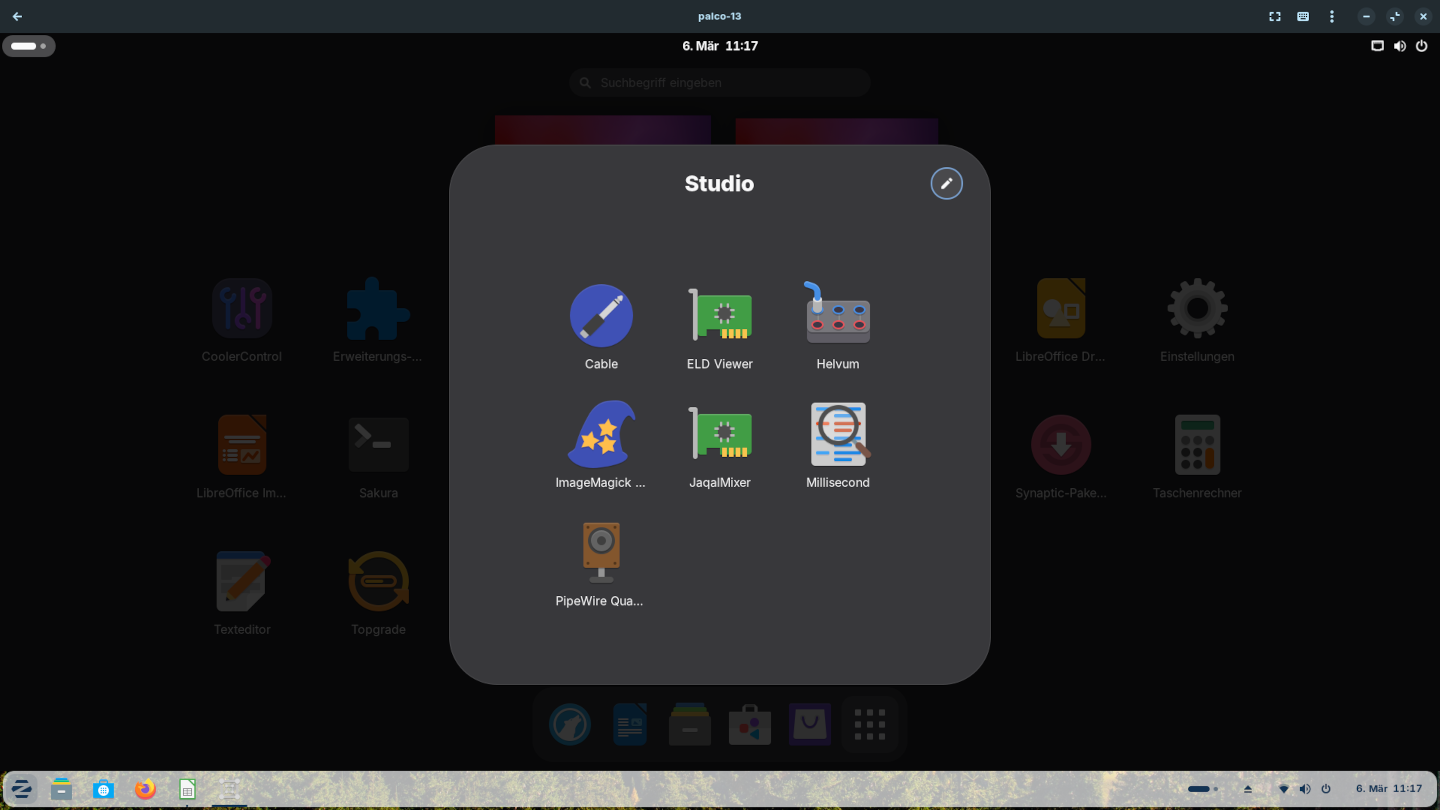 Palco 13 basiert auf Debian und kommt aus Brasilien. Die Macher bezeichnen die Distro als Studio Version zum erstellen bzw. bearbeiten, von Bild, Film und Musik. Ein paar Anwendungen, welche in diese Richtung gehen, kommen mit der Installation auf den Rechner. Allerdings muss jede Menge nachinstalliert werden, damit alle Anforderungen an eine Studio Distro erfüllt werden. So, wie es ist, kann es als besseres Office OS genutzt werden.