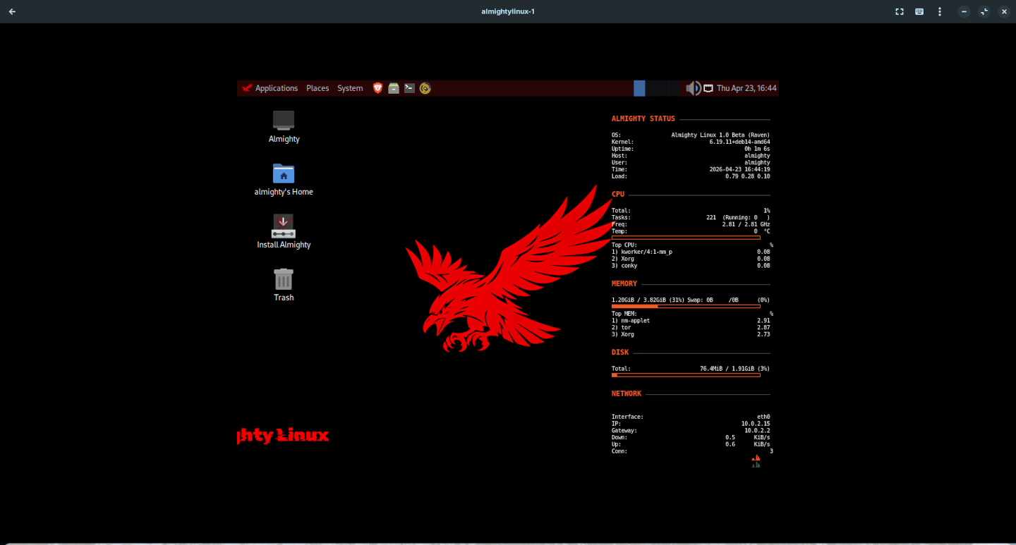 Almighty Linux basiert auf Debian und Kali Linux. Die ISO hat eine Größe von 3,8 GB. Die Distro ist dazu bestimmt,Fehler in Installationen zu finden und dabei auch selber fehlerresistent zu sein.Als Desktop dient Mate.